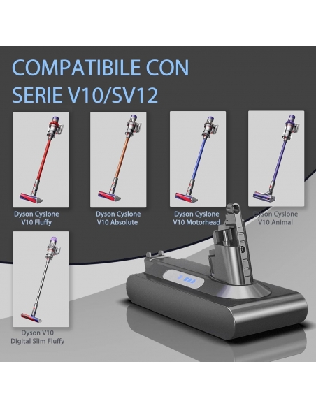 - 🔋 【 6.0Ah NUOVA E PIÙ ALTA CAPACITÀ】Capacità 6000mAh / ioni di litio ricaricabili . La batteria FLYLINKTECH V10 può essere caricata con il caricatore rapido originale V10 in circa 2,8 ore. Modalità aspirapolvere Max: almeno 6 minuti, modalità normale: almeno 30 minuti. Nessun effetto memoria. Nota: non adatta all'aspirapolvere V8 SV10.
