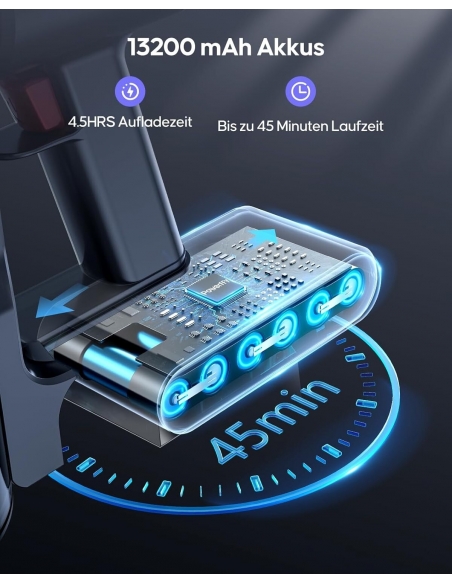 - L'aspirapolvere senza fili è dotato di una batteria di grande capacità da 13200 mAh, tempo di lavoro fino a 45 minuti (bassa velocità), almeno 20 minuti (alta velocità). La cosa migliore è che ci vogliono solo 4,5 ore per caricare questo aspirapolvere senza filo e recupera rapidamente le sue prestazioni di pulizia. Inoltre, non caricare il dispositivo in ambienti caldi o umidi