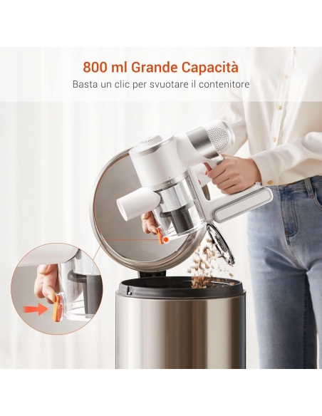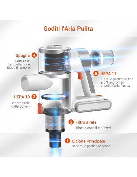 - Esperienza di pulizia ottimale: Filtrazione a 5 fasi, che filtra fino al 99% di polvere, polline e allergeni; cattura le particelle fini fino a 0,3 micron, offrendo un'esperienza di pulizia migliore e più sicura. Trattiene efficacemente lo sporco senza cadere facilmente e rilascia aria fresca priva di allergeni. Inoltre, separa efficacemente la polvere e lo sporco di diverse dimensioni per evitare l'intasamento del filtro.