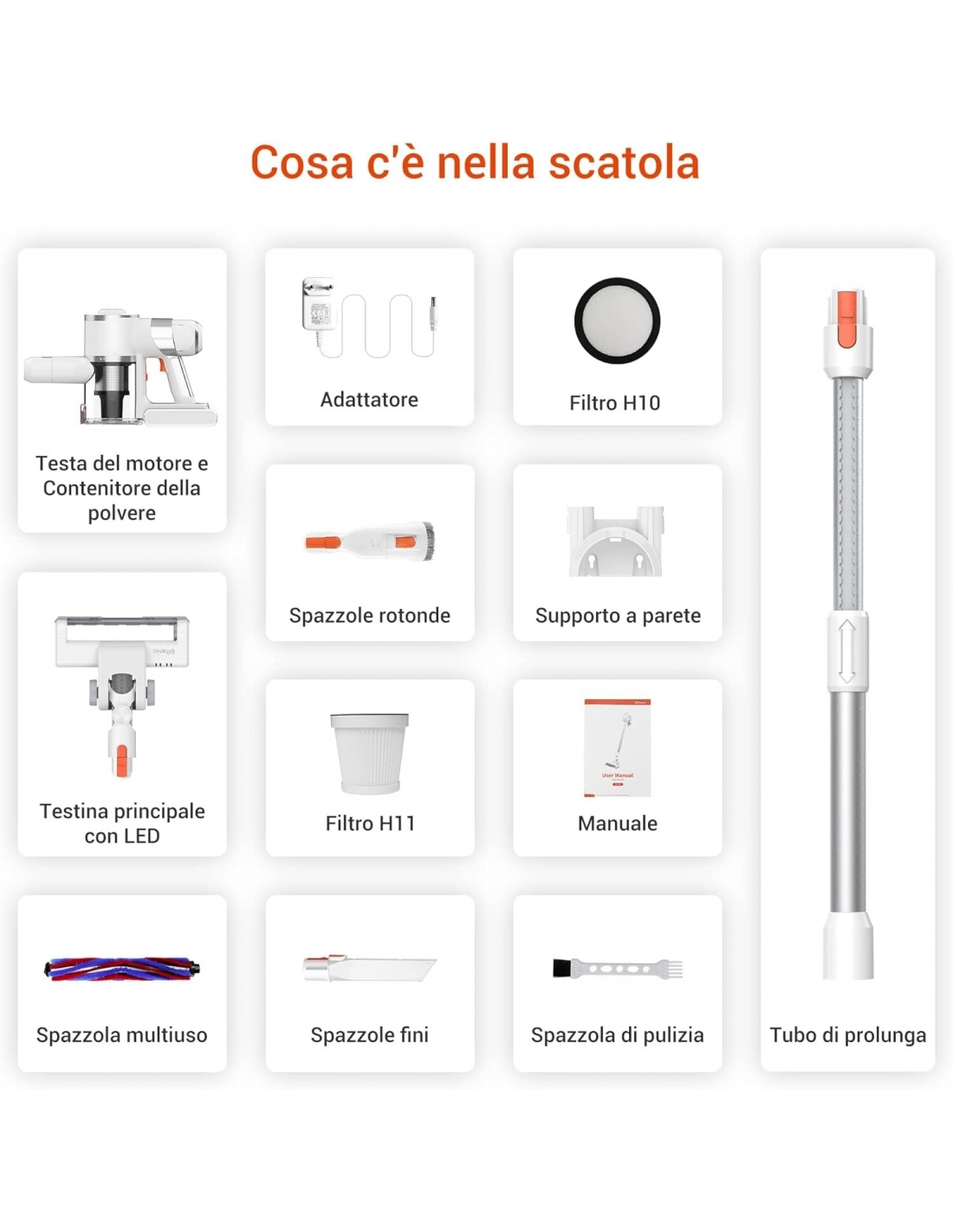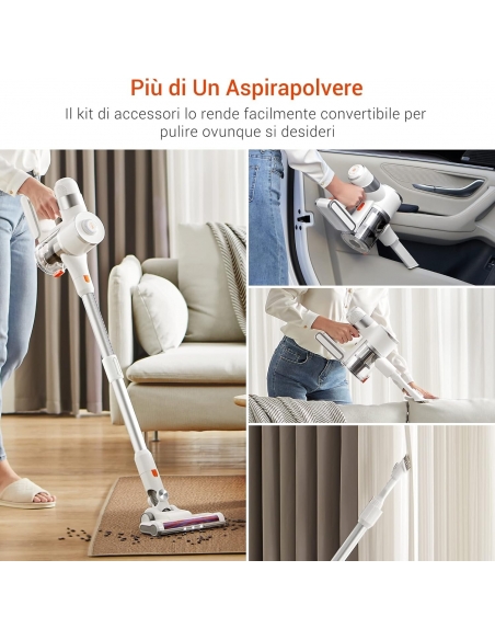 - Funzionamento ultra-silenzioso: L'aspirapolvere senza fili U10 Pro ha un basso livello di rumore di 65 dB durante il funzionamento. Pulizia efficiente con minore disturbo dell'ambiente circostante.