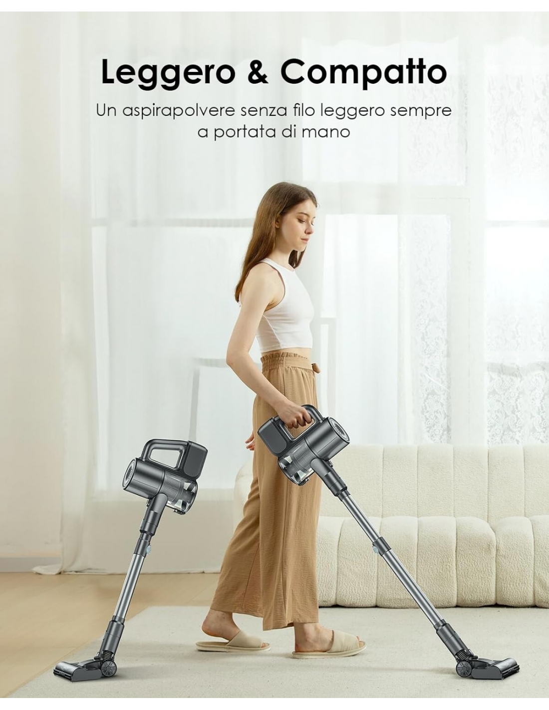 - L'aspirapolvere senza filo può essere posizionato praticamente in qualsiasi spazio o angolo, grazie al suo design stretto. Può anche stare in piedi da solo, il che è un vantaggio quando si fa una breve pausa dall'aspirazione o quando si carica il dispositivo.Il design senza fili e leggero consente di pulire rapidamente e facilmente senza il fastidio di un cavo, con soli 2.4kg, questo ti consentirà di aspirare facilmente stanze particolarmente grandi, come lunghi corridoi o ampi soggiorni