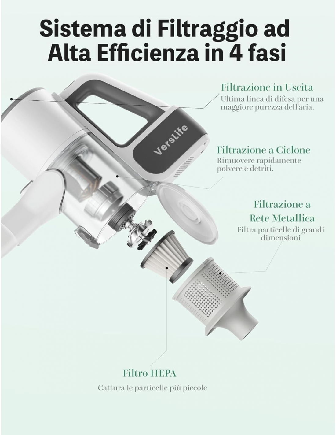 - Questi quattro strati si combinano per formare un potente sistema di filtraggio, garantendo un'esperienza di pulizia efficace e completa, aumentando al contempo l'efficienza complessiva dell'aspirapolvere.