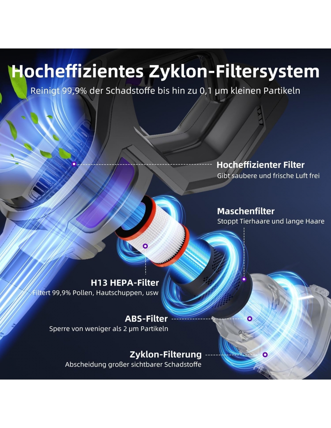 - Filtro di alta qualità: il sistema di filtraggio dell'aspirapolvere garantisce una purezza dell'aria di scarico del 99,9%. Filtro ad alta efficienza H13: filtra il 99,9% delle particelle microscopiche. Filtro ciclonico: cattura le particelle visibili di grandi dimensioni. Filtro a rete metallica: blocca capelli e peli di animali. Filtro ABS: isola le particelle inferiori a 2 μm. Che si tratti di polvere, frammenti di carta, piccoli sassolini o gusci di noci, peli di animali, la batteria dell'aspirapolvere può gestirli con facilità.
