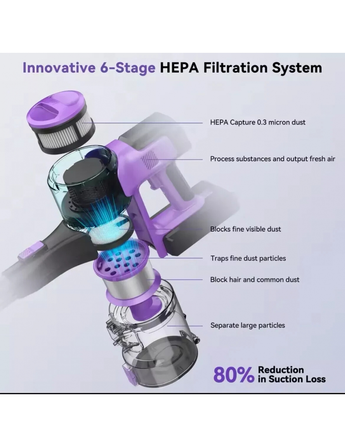 Potenza di aspirazione: 30Kpa grazie al motore potente da 350W, perfetto per raccogliere polvere, peli di animali, e detriti su diverse superfici.