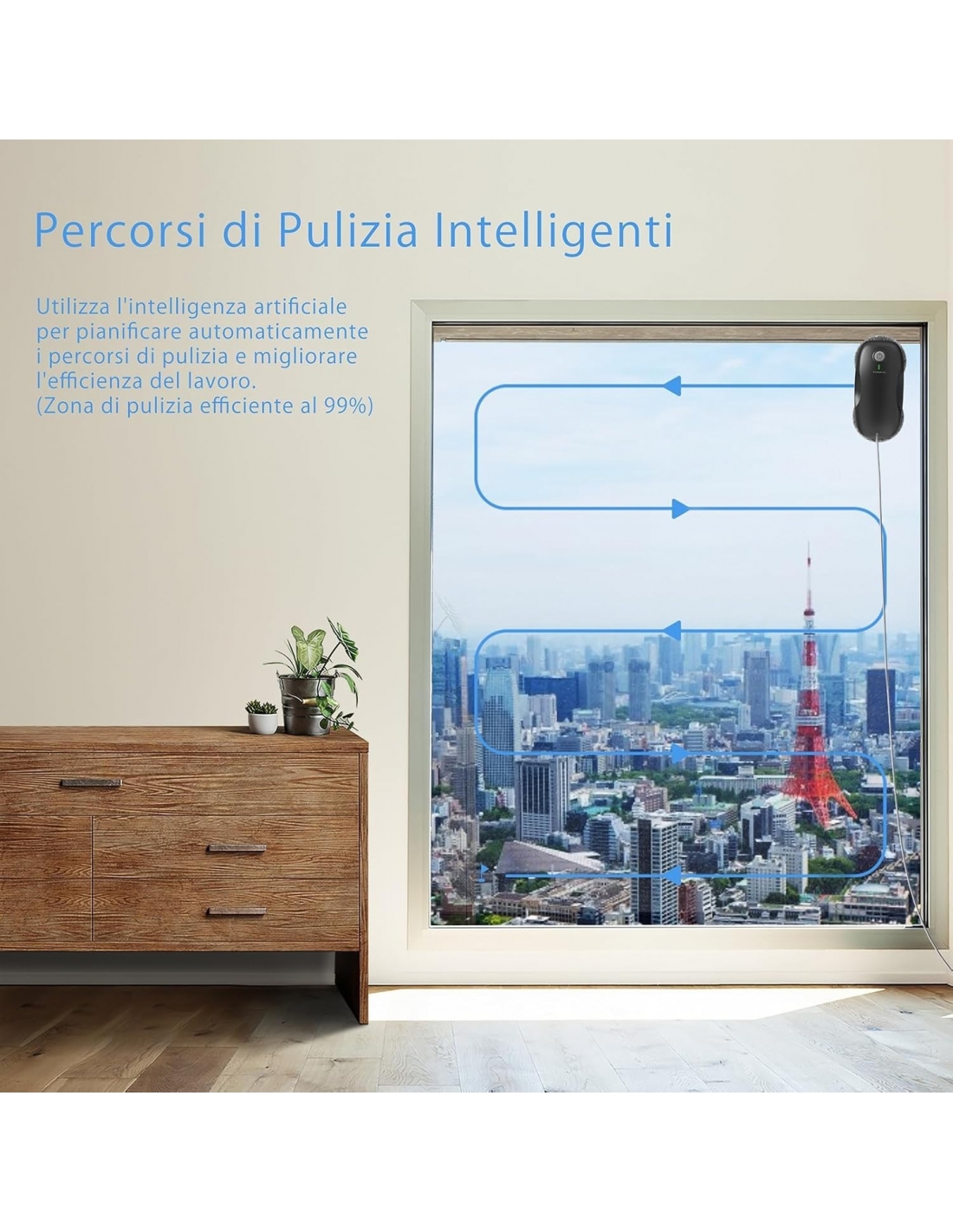 - 【Tripla Protezione Anti-Caduta Certificata】 Robot lavavetri finestre con protezione certificata, Sistema di sicurezza avanzato: Cavo di sicurezza da 5M (testato a 120kg di carico massimo) Batteria agli ioni di litio 650mAh (fino a 25 minuti di autonomia in caso di blackout Sensori intelligenti che rilevano i bordi e prevengono cadute accidentali.