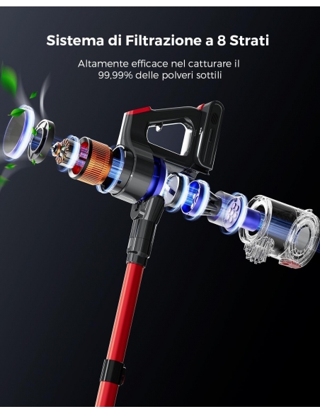 - 550W HyperCore Pro Motore Senza Spazzole: Il aspirapolvere senza fili è dotato di un nuovo motore brushless HyperCore Pro da 550 W con una speciale tecnologia di riduzione del rumore (<62 dB) per un funzionamento silenzioso che non disturba la famiglia o gli animali domestici. La potenza di aspirazione di picco del aspirapolvere, fino a 48 kPa, rimuove con forza lo sporco più profondo e le particelle più ostinate da tappeti, pavimenti e fessure per una pulizia sempre efficace.