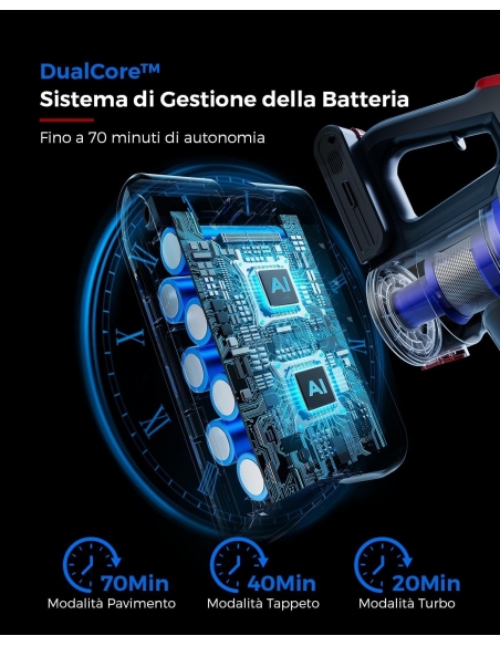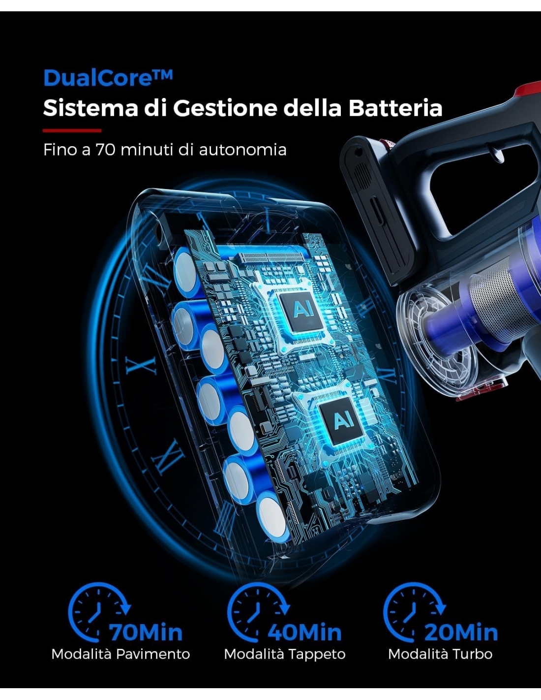 - DualCore Sistema di Gestione della Batteria: Scopa elettrica senza fili adotta una scheda di protezione dual-core e una tecnologia di bilanciamento dinamico del carico per ottimizzare la gestione della batteria e garantire un'aspirazione stabile. Supporta diverse modalità di pulizia: Modalità Pavimento (70 minuti), Modalità Tappeto (40 minuti), Modalità Turbo (20 minuti), che soddisfa le esigenze di pulizia di diverse famiglie e consente di pulire senza preoccupazioni.