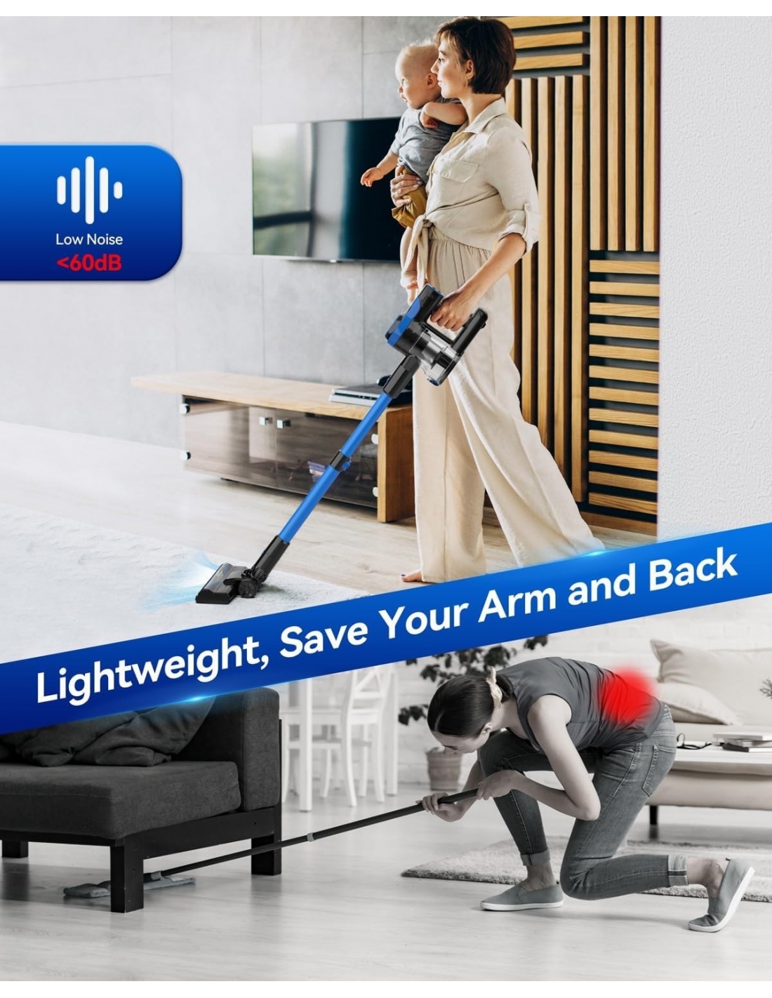 - 【Aspirazione Potente & Super Silenzioso】L'aspirapolvere senza fili dotato di un potente motore da 200W e 2 modalità di aspirazione offre una potenza di aspirazione di 20Kpa nella modalità massima. Raccolgere polvere, detriti e capelli dalle diverse superfici è un gioco da ragazzi. Inoltre, questo aspirapolvere è estremamente silenzioso, con un livello di rumore di circa 60dB, in modo da non disturbare i tuoi coinquilini, animali domestici o vicini.