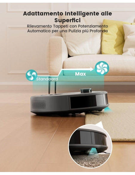 - Riconoscimento Intelligente dei Tappeti con Regolazione Automatica: Grazie al riconoscimento automatico dei tappeti, il robot identifica la superficie e adatta la modalità di pulizia, aumentando l’efficacia dell’aspirazione sui tappeti e mantenendo un funzionamento equilibrato sui pavimenti duri. Questa funzione rende il robot aspirapolvere per tappeti ideale per ambienti con superfici diverse.