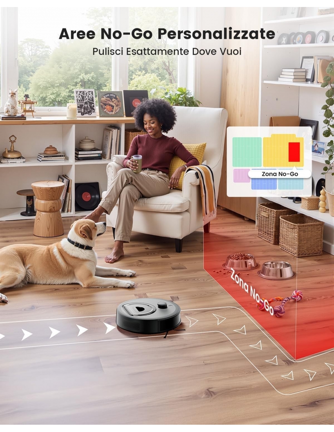 - Navigazione Laser dToF a 360° e Mappatura Avanzata: La navigazione laser dToF a 360° consente una mappatura precisa dell’ambiente e una pianificazione intelligente del percorso. Il sistema di evitamento ostacoli PSD a 190° rileva mobili, cavi e oggetti, riducendo collisioni e garantendo una copertura uniforme. Supporta la mappatura multi-livello fino a 3 piani, ideale per case a più livelli.