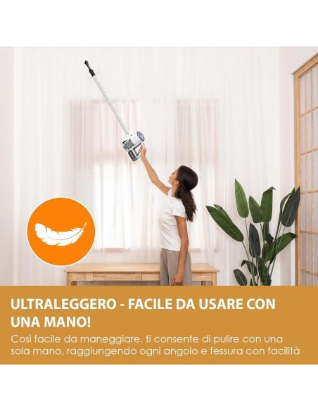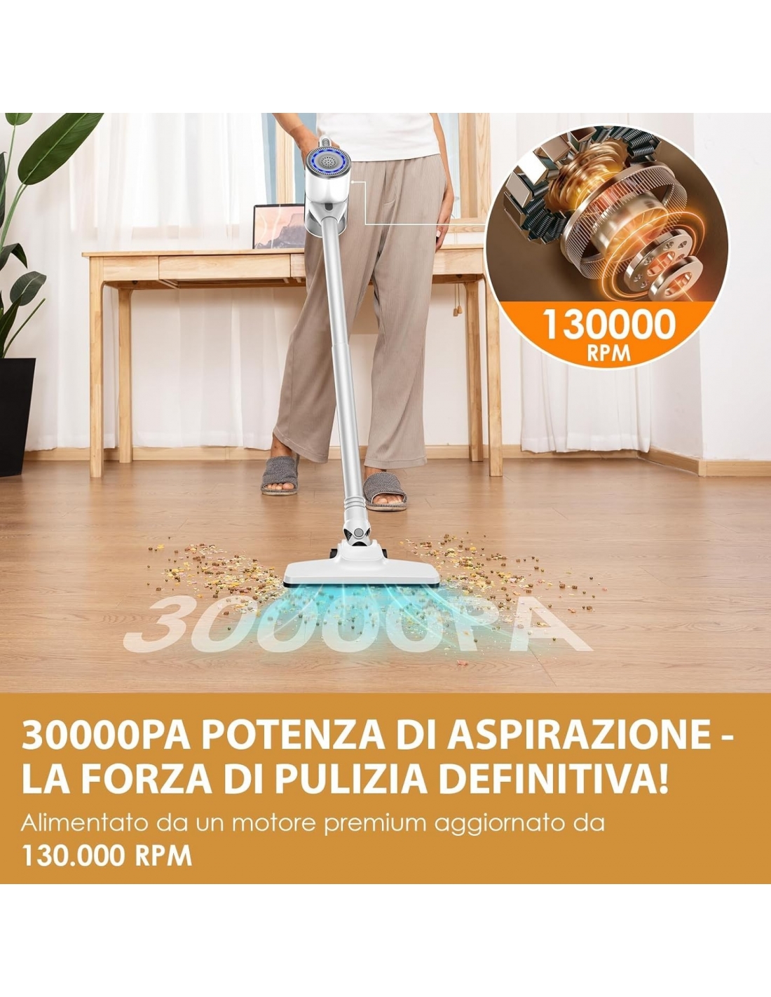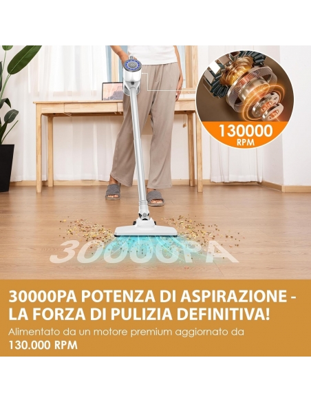 - 🔋【Autonomia Lunga 30 Minuti】Con la batteria a litio da 2200mAh (6 celle), l'aspirapolvere opera fino a 30 minuti in modalità ECO (15 minuti in modalità MAX), perfetto per pulizie complete di grandi ambienti
