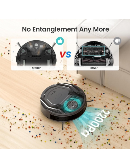 - Con una bassa potenza di aspirazione selezionata, il robot aspirapolvere M210-P può funzionare su pavimenti in legno per un massimo di 120 minuti. Il rumore bianco uniforme e regolare come il suono di un elettroventilatore generato non interferirà con il tuo lavoro o riposo.