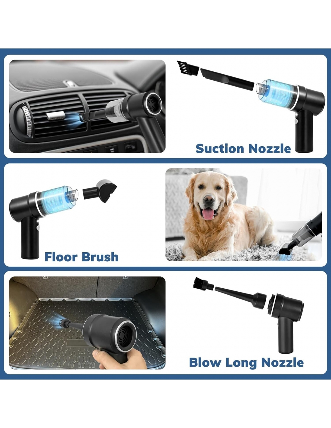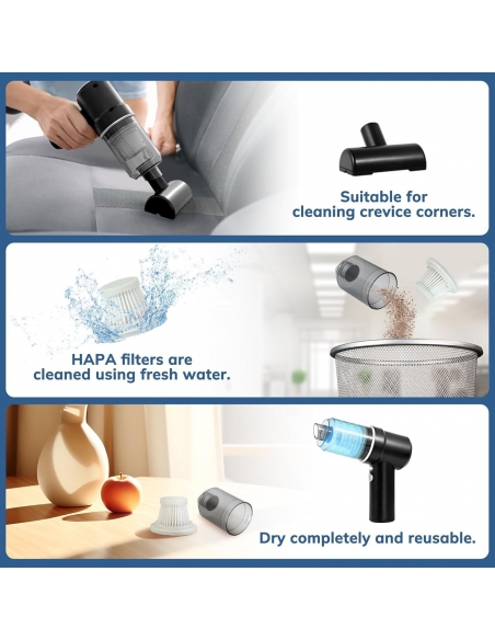 - Il nostro aspirapolvere portatile per auto con 2 funzioni è perfetto per una varietà di attività di pulizia. Non solo può soffiare via ampie aree di polvere e sporco dalle superfici, ma può anche aspirare detriti e persino particelle sottili da angoli stretti e fessure dell'auto, lasciando il tuo spazio impeccabile.