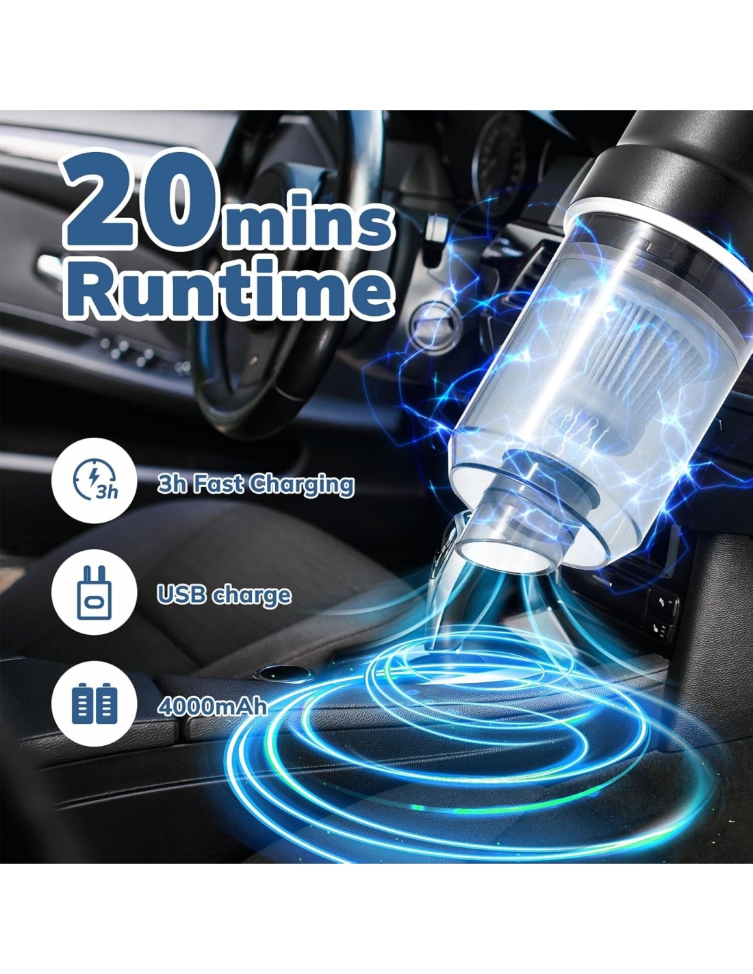 - L'aspirapolvere portatile senza fili è progettato per la praticità, con un peso leggero e dimensioni ridotte, può essere facilmente ricaricato utilizzando un caricabatterie per auto, un alimentatore mobile, un laptop e altro ancora. L'aspirapolvere portatile per auto è alimentato da una batteria ad alta capacità da 4000 mAh e può essere ricaricato rapidamente entro 3 ore.