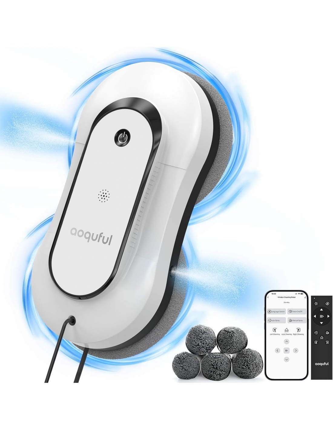 Aoquful Robot Intelligente per la Pulizia delle Finestre - Pulitore Elettrico con Doppio Spruzzo d'Acqua, Controllo Remoto e App, Adatto per Vetri Interni ed Esterni, Include 12 Panni, Bianco