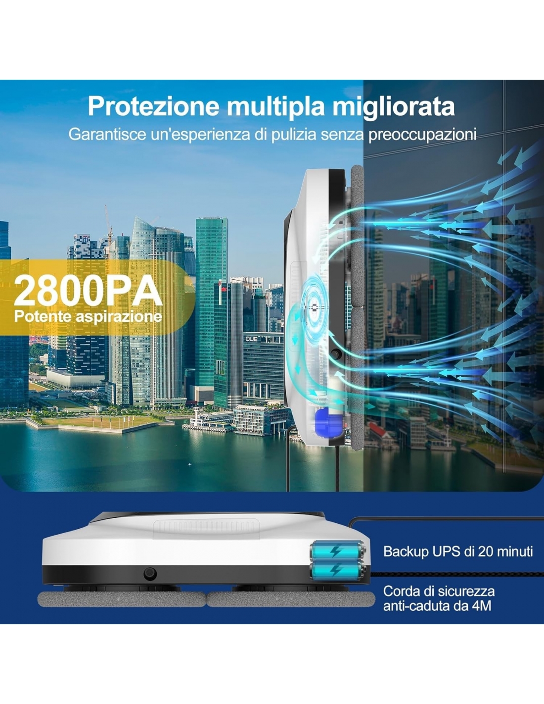 - Tripla Protezione di Sicurezza: Progettato con un sistema di sicurezza tripla, questo robot include rilevamento dei bordi e un potente motore di aspirazione da 2800 Pa per garantire un fissaggio sicuro alle superfici verticali. La batteria UPS integrata mantiene il robot aderente al vetro per 20-30 minuti in caso di interruzione di corrente, con monitoraggio e allarmi continui. Inoltre, una corda di sicurezza da 4 metri previene cadute anche in caso di guasto completo.