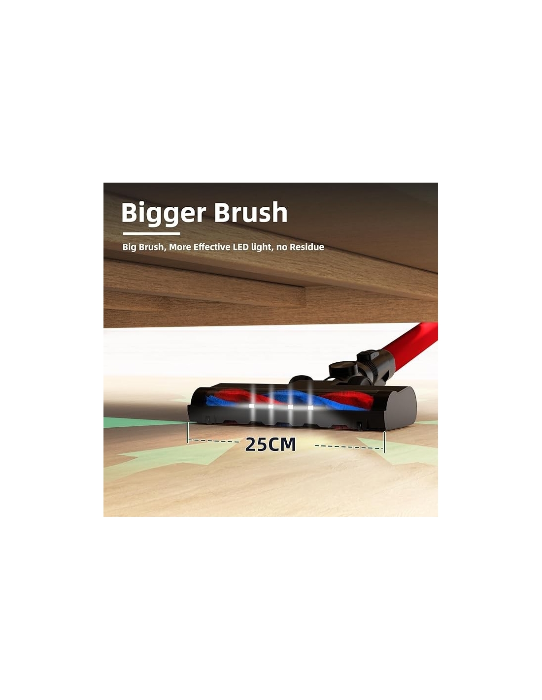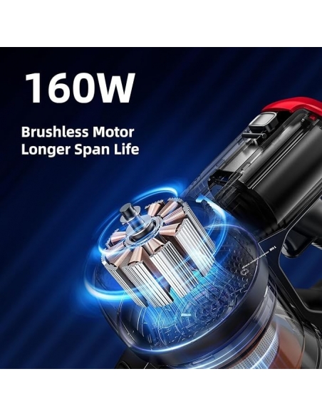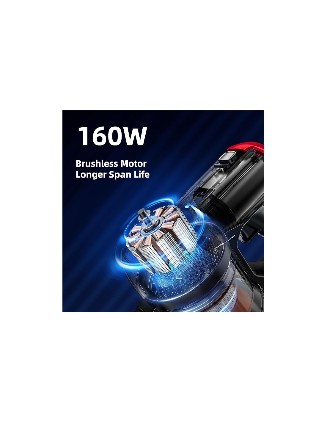 - 【Potente Aspirazione, Motore Brushless】Dì addio allo sporco ostinato e ai peli degli animali domestici! Aspirapolvere senza fili potente è dotato di un motore brushless da 160W e 2 modalità di pulizia, offrendo un'impressionante potenza di aspirazione di 25Kpa. Rimuovi senza sforzo lo sporco, i detriti, la polvere, le briciole e i fastidiosi peli degli animali domestici, lasciando le tue superfici impeccabili.