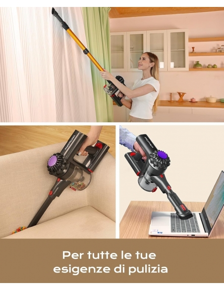 - 【6 in 1 Aspirapolvere】L'aspirapolvere a bastoncino è inoltre dotato di una spazzola a lancia e di un ugello combinato, così da poterlo convertire rapidamente in un aspirapolvere portatile per pulire divani, auto, scale e tappezzeria. Il tubo telescopico consente di regolarne la lunghezza in base alle esigenze, permettendo di raccogliere la polvere anche su soffitti e ventole difficili da raggiungere