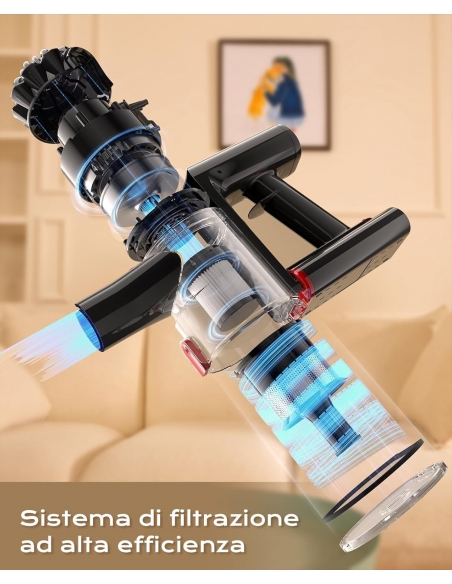 - 【Sistema di filtrazione ad alta efficienza】Grazie alla nuova tecnologia ciclonica e alla rete ad alta densità, l'aspirapolvere senza fili potente aiuta a eliminare fino al 99,97% delle particelle di polvere microscopiche di dimensioni fino a 0,3 micron, offrendo quindi aria purificata per la tua famiglia