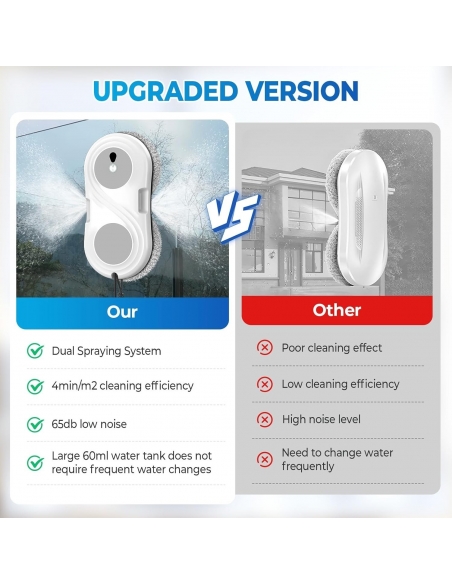 - 💦 Sistema di Doppia Nebulizzazione – Rispetto ai robot lavavetri finestre tradizionali, questo robot lavavetri finestre utilizza una tecnologia avanzata di spruzzo bilaterale, coprendo un’area più ampia e rimuovendo anche lo sporco più ostinato. Il serbatoio da 60 ml consente un uso continuo senza frequenti ricariche.