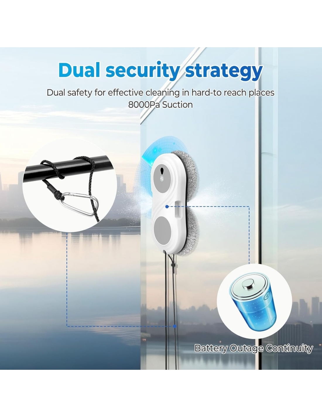 - 🛡️ Sistema di Sicurezza Anticaduta – Dotato di batteria di emergenza, il robot pulisci vetri rimane attaccato alla superficie per 30 minuti in caso di blackout. La corda di sicurezza da 4 metri offre ulteriore protezione, perfetta per finestre alte.
