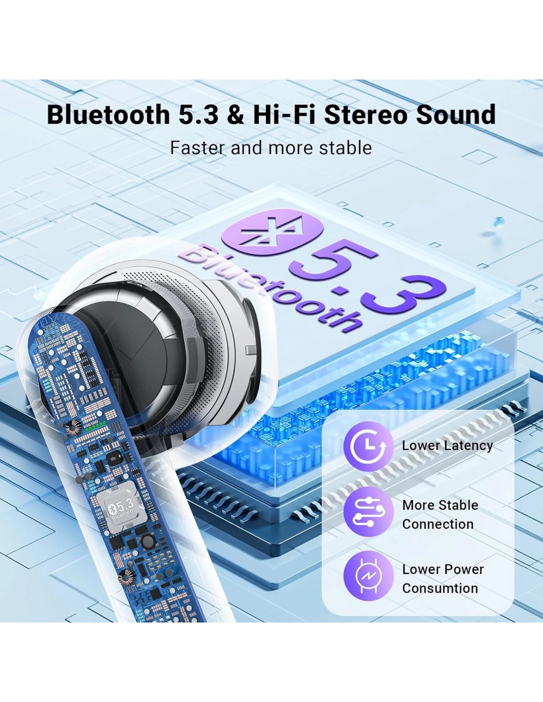 Bluetooth 5.3: Gli auricolari wireless 5.3 adottano l'avanzata tecnologia Bluetooth 5.3, supportano HID, HFP, A2DP, AVRC, offrendo un'esperienza audio senza precedenti, una velocità di trasmissione a breve distanza più elevata, una connessione del segnale più stabile, una facile commutazione tra modalità singola e doppia, ideale per l'uso a casa, in ufficio o in viaggio.