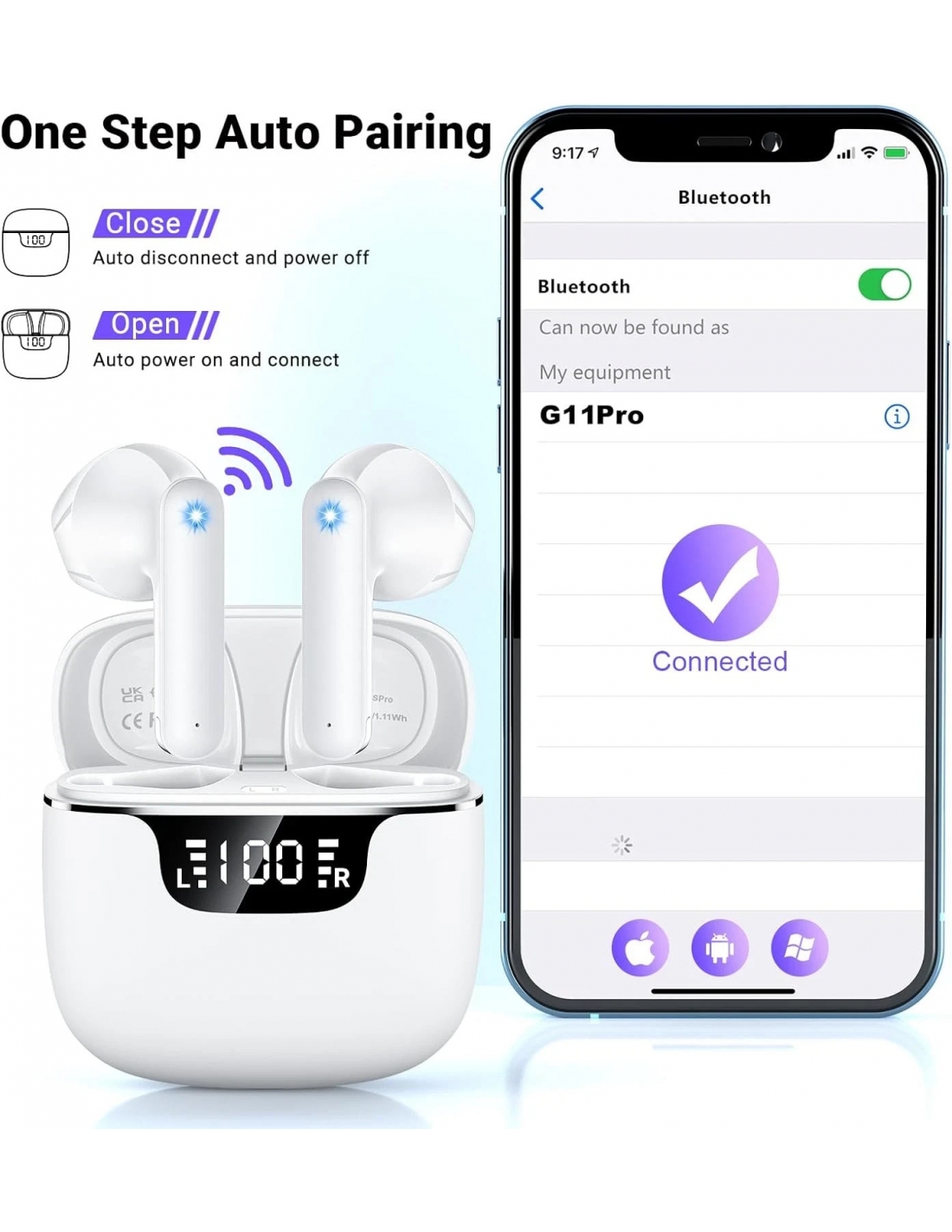 Display a LED e controllo tattile】 Le cuffie wireless G11pro creano più divertimento grazie alla tecnologia avanzata. È possibile controllare facilmente riproduzione e pausa/tracce musicali/volume/assistente vocale e chiamate toccando con il dito i punti di contatto delle cuffie. L'esclusivo display digitale intelligente consente di verificare facilmente la capacità della batteria e di controllare lo stato di carica del dispositivo in qualsiasi momento.