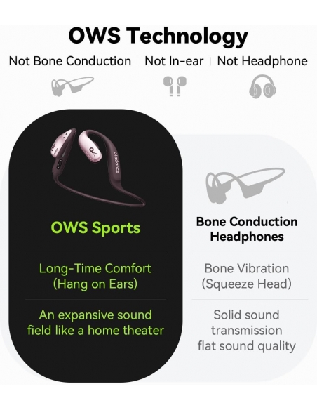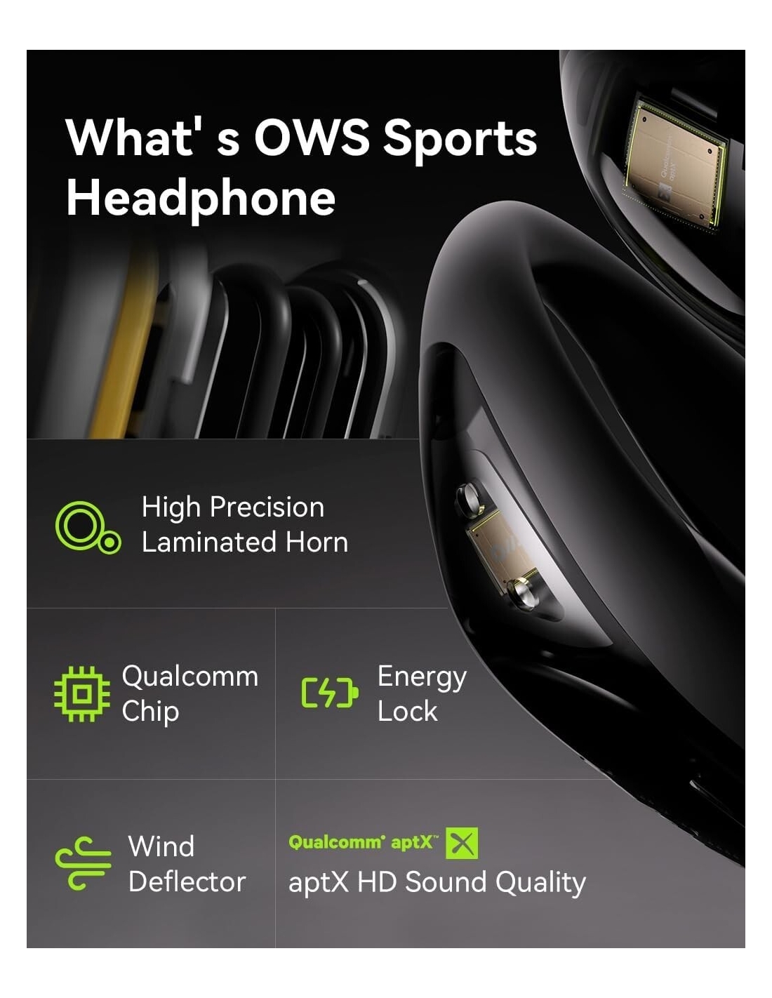 - Esperienza di ascolto premium: con doppi altoparlanti da 23 x 10 mm e un chip Qualcomm aptX. L'algoritmo brevettato Virtual Bass 2nd utilizza un'elevata potenza dinamica, garantendo un'esperienza di bassi migliorata. Le cuffie sportive OWS creano bassi più potenti e un'esperienza audio a 360° riducendo la distorsione ad alta frequenza.