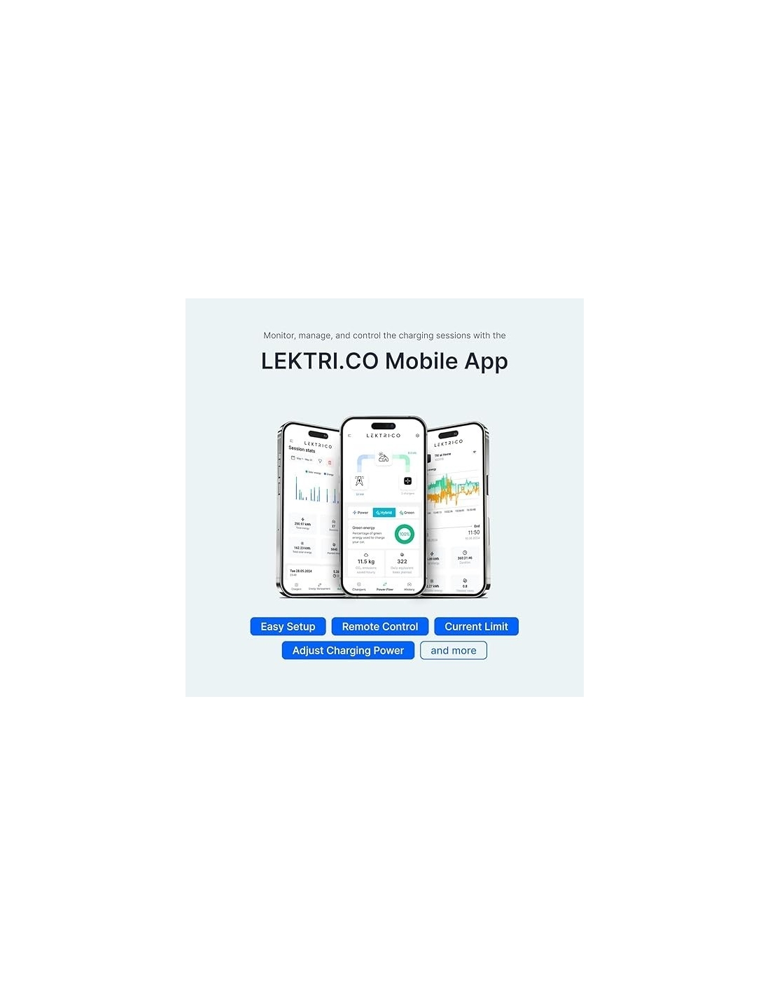 - CONTROLLO DELL'ENERGIA TRAMITE APP – Con l'app mobile LEKTRI.CO, hai la possibilità di impostare manualmente la corrente di ricarica, offrendo la flessibilità desiderata.