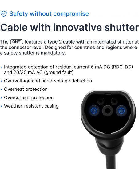 - CAVO INNOVATIVO CON CONNETTORE CON OTTURATORE - Questo cavo è dotato di una tecnologia all'avanguardia che garantisce la massima protezione a livello del connettore Type 2. Dispone di un sistema di otturatori che impedisce l'accesso accidentale all'elettricità, rendendolo particolarmente sicuro per le famiglie con bambini; gli otturatori non consentono l'apertura accidentale all'inserimento di oggetti estranei nei fori di contatto, eliminando così il rischio di contatto elettrico. Progettato specificamente per i mercati in cui la presenza degli otturatori è un requisito legale.