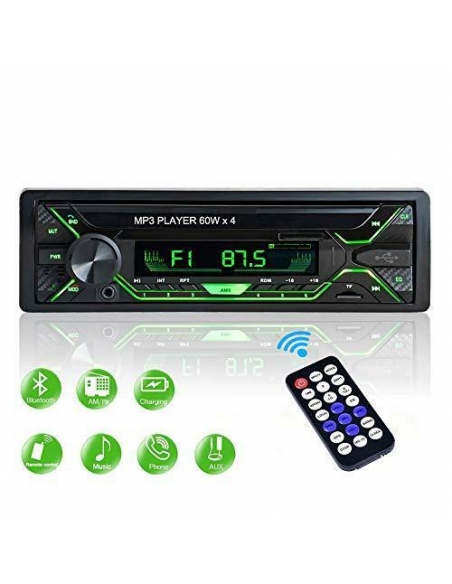 Autoradio con sistema stereo digitale di alta qualità. Stazione di ricerca automatico e semi-automatico, salva le stazioni che ti piacciono. La radio FM (87.5-108 MHz) può memorizzare 18 stazioni radio. Ascolta anche musica, newsletter, informazioni sul traffico. Divertiti sempre.L'autoradio è dotato di funzione Bluetooth, si collega al telefono tramite Bluetooth, quindi è possibile riprodurre musica, supportare chiamate in vivavoce, consentendo di ricevere chiamate e guidare in modo sicuro.1 porta USB, 1 cavo AUX (3,5mm) e 1 porta TF (32GB). La porta USB supporta solo la Carica telefoni cellulari batteria USB da 5V. La porta TF supporta tutti i tipi di schede TF e SD Carta, che è in grado di aggiungere file MP3/WMA, ecc. L'interfaccia di ingresso AUX consente di aggiungere file MP3, MP5, GPS.Rispetto al tradizionale schermo singolo, le luci a LED a 5 colori vengono sostituite automaticamente, goditi la tua colorata esperienza.SUGGERIMENTI: Premere a lungo la manopola e sullo schermo della radio compare il nome del colore. Quindi ruotare la manopola per scegliere un colore che ti piace.