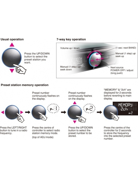 Gran parte delle funzioni sono state integrate in questo controllo unico. Oltre alla regolazione del volume, serve per le funzioni su/giù per la selezione delle stazioni radio preimpostate o per la funzione sinistra/destra per la sintonizzazione manuale. Data la sua dimensione, è facile da controllare durante la guida.