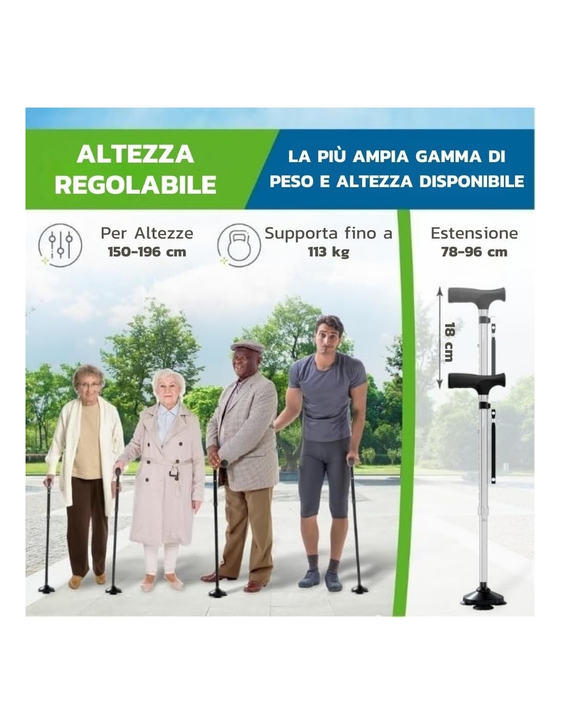 - Autoportante: La base extra larga con tre punte permette al bastone di rimanere in piedi da solo sulla base da 10 cm. Il bastone ideale per uomini e donne di tutte le età.