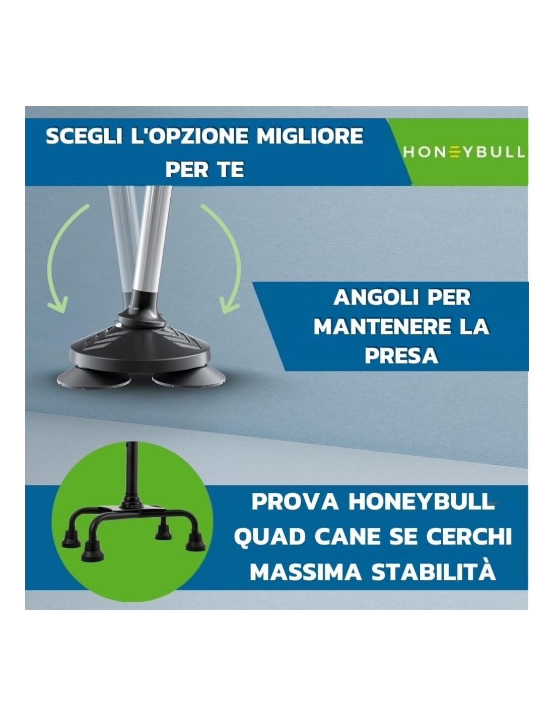 - Punta snodata: La base si inclina per rimanere stabile su qualsiasi superficie. Massima aderenza al suolo grazie alla base in gomma antiscivolo. La base a tre punte è perfetta per ogni tipo di terreno.