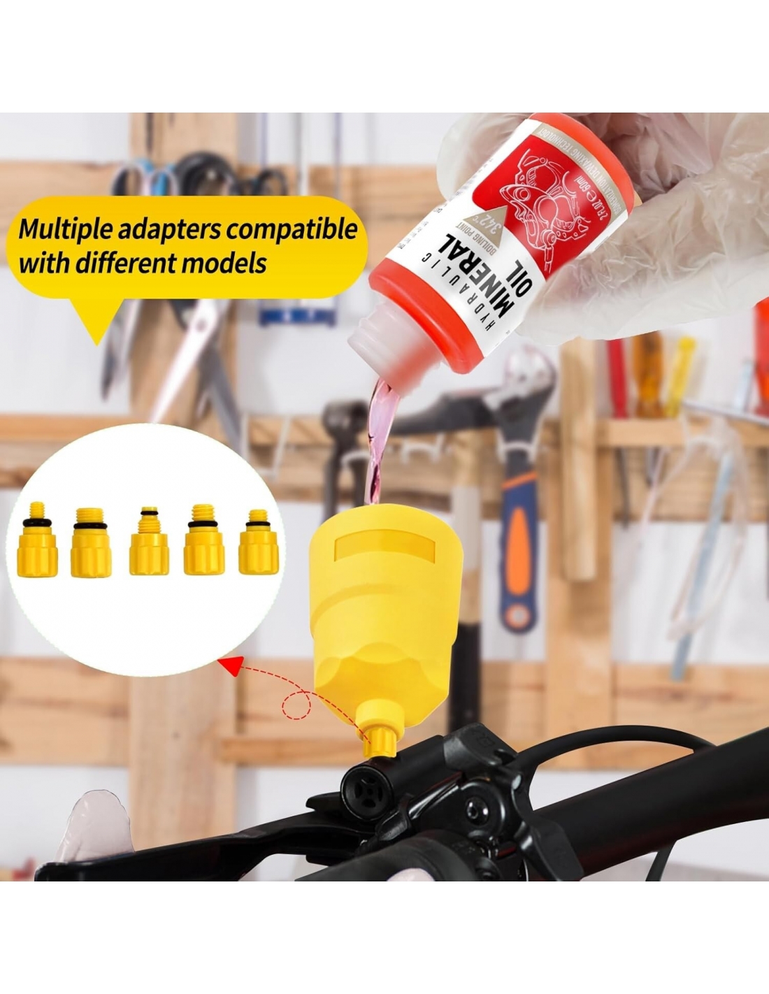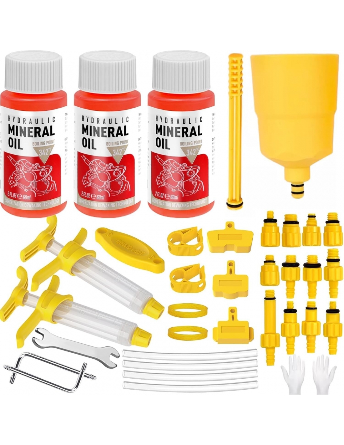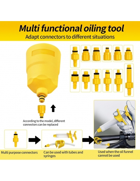 - Set Completo: Il kit idraulico di dissanguamento del freno include 3 * 60 ml di liquido frenante dell'olio minerale, 2 * iniettore di dissanguamento, imbuto, imbuto intasato, 12 * adattatori, 4 * tubo flessibile, 2 * tappo di flusso, 2 * banda di gomma, 3 * tappo pistone, 1 * L chiave T15, 1 * L chiave T25, chiave, 2 * guanti, istruzioni
