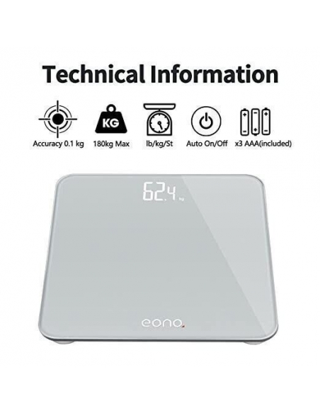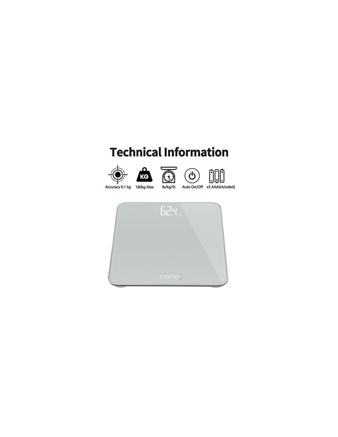 Eono Bilancia Pesapersone Digitale, Con Sensori Ad Alta Precisione e Vetro Temperato, Ultrasottile, Per il Bagno, Peso in stone/kg/libbre – Argento