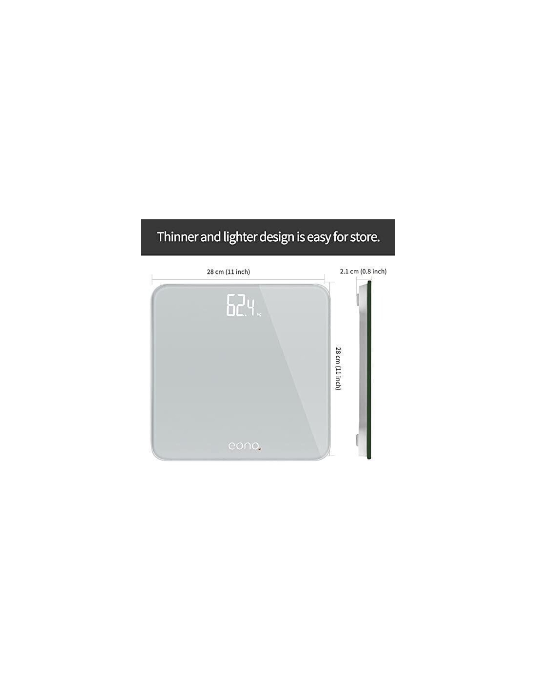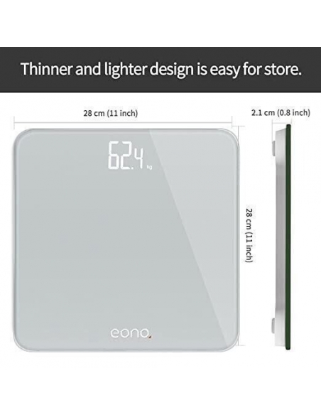 Design premium: La bilancia Eono per il bagno ha un display LED luminoso e facile da leggere che si spegne quando non è in funzione per un'estetica sobria e pulita. In vetro temperato trasparente, ultrasottile e comoda, grande 28 x 28 cm.
