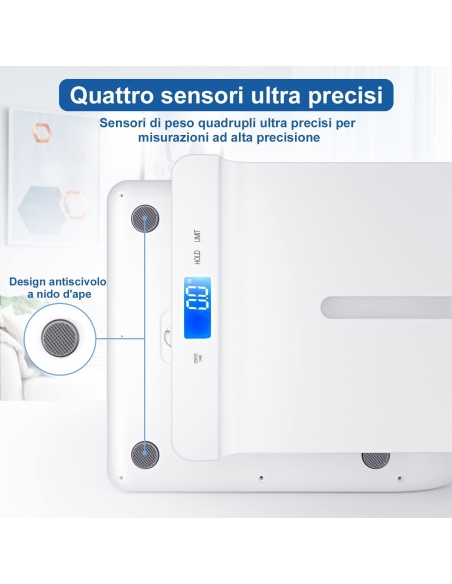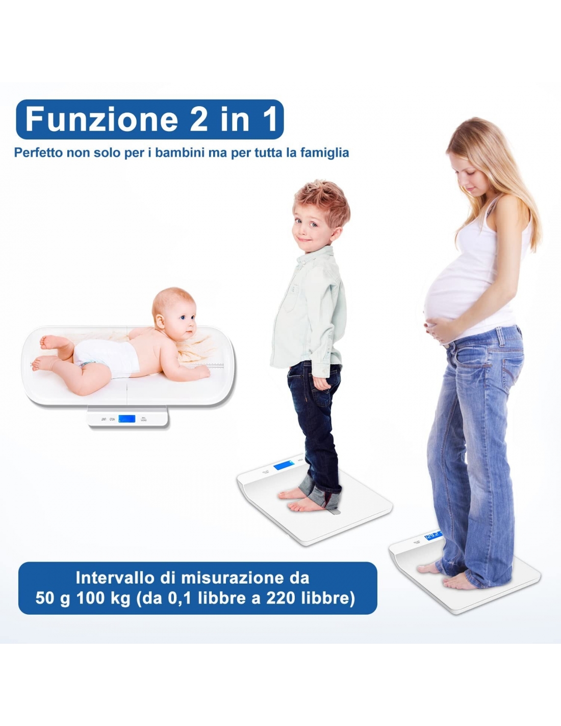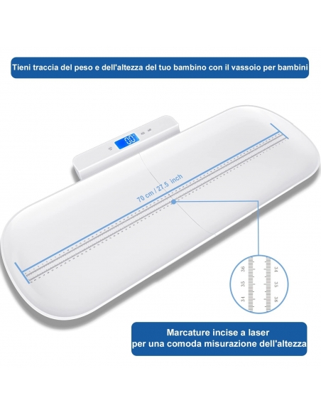 - Funzione "Stabilizza" e "Tara": Tramite la funzione "Stabilizza", la bilancia neonati può stabilire velocemente il peso accurato di un bambino vivace. La funzione "Tara" può sottrarre facilmente il peso dei vestiti del tuo bambino per assicurare delle letture accurate. Con la misurazione dell’altezza all’interno del piatto, la bilancia può leggere anche l’altezza del bambino