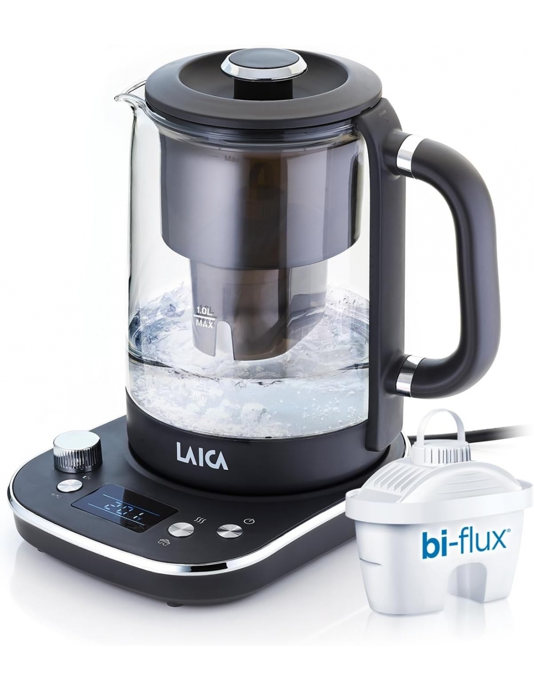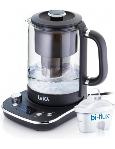 LAICA ISEO Bollitore Elettrico Capacità 1,5L con Livelli di Temperatura Variabili + 1 Cartuccia Filtro Acqua Bi-flux® per Tè e Caffè, 2.5kw - Vetro, Nero