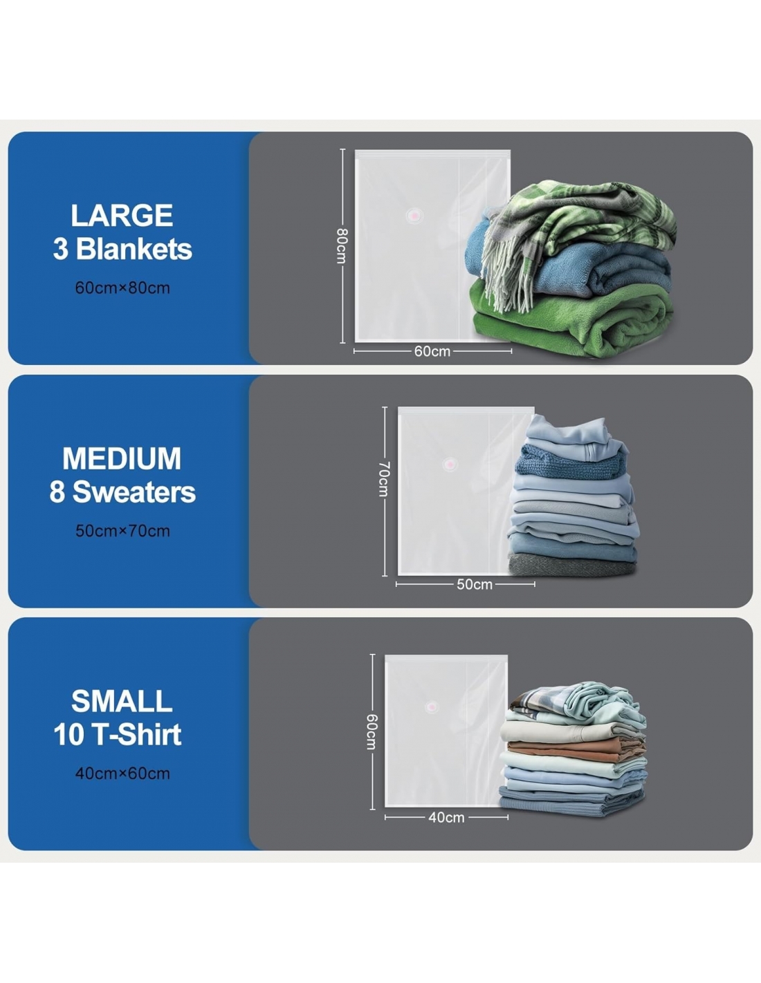 - 3 diverse dimensioni: forniamo 12 sacchi per abiti in 3 diverse misure, 4 grandi, 4 medie, 4 piccole, che ti permettono di riporre in modo sicuro una grande quantità delle tue diverse dimensioni fuori stagione vestiti o biancheria da letto negli armadi, nei cassetti o sotto il letto. Per riporre vestiti, come piumini, trapunte, cuscini, coperte, cappotti, maglioni, giacche, peluche, asciugamani, accessori da viaggio, magliette, abiti e così via