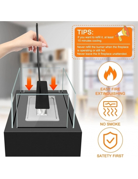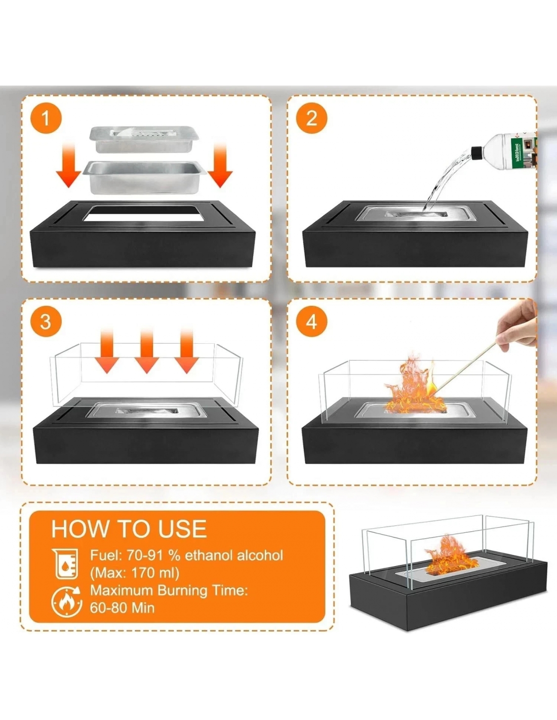 - È sufficiente versare il (circa 170 ml) nel contenitore e accenderlo, il tempo di combustione è di 40-80 minuti (la confezione non contiene). Questo caminetto da tavolo inoltre non produce fumi nocivi o odori fastidiosi.