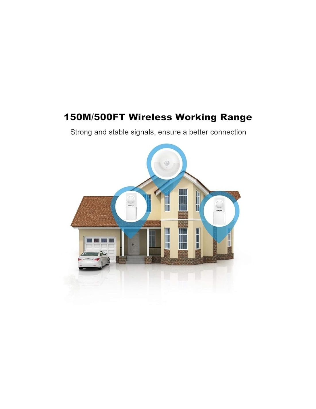 RANGE DI TRASMISSIONE ULTRA LUNGO: i segnali di trasmissione tra il campanello senza fili e il ricevitore interno possono essere trasportati da una stanza all'altra con un raggio di trasmissione fino a 150 m (senza ostacoli), in modo da poter posizionare il ricevitore nella posizione più adatta a te.