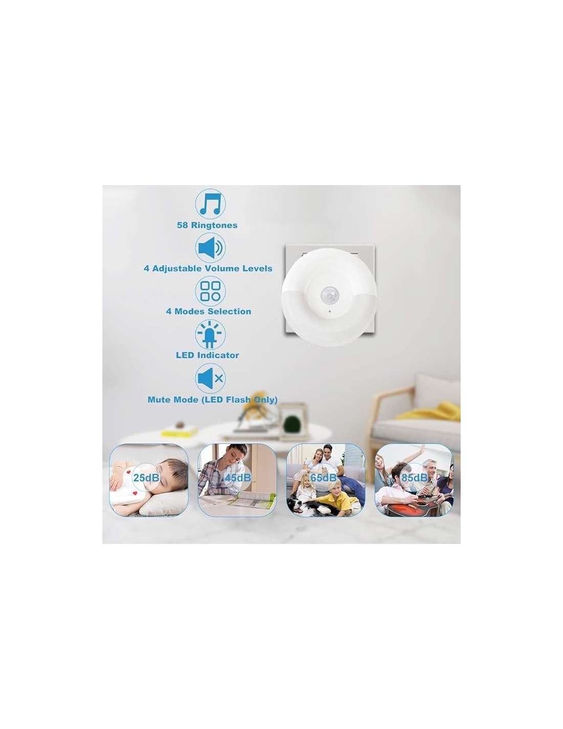 4 MODALITÀ DI NOTIFICA E LUCE NOTTURNA CON SENSORE: 1) Solo suoneria; 2) Solo flash LED; 3) anello+lampeggio LED; 4) anello+LED sempre accesi. Inoltre, con un sensore di movimento PIR, il ricevitore può fungere da piccola luce notturna al buio o di notte. Quando qualcuno passa, si accende e dopo che la persona si allontana per circa 30 secondi, la luce si spegne. Quindi puoi collegarlo dove vuoi, ad esempio: corridoi, scale, stanze per bambini, ecc.