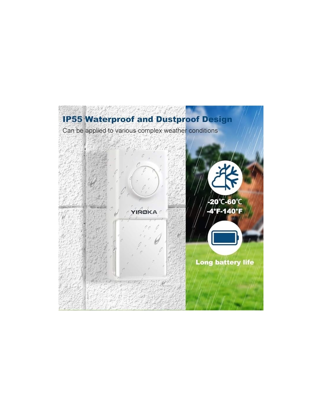 IP55 IMPERMEABILE E LUNGA DURATA DELLA BATTERIA: grado di impermeabilità IP55, può resistere alle peggiori condizioni atmosferiche. Con 58 suonerie uniche e 4 volumi regolabili (25-85 dB) per soddisfare le diverse esigenze. Dotato di batteria CR2032 ad alte prestazioni, può essere utilizzato fino a 12 mesi (attivazione 5-10 volte al giorno).
