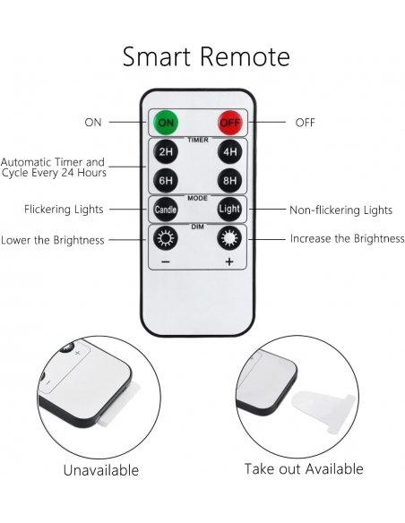 Telecomando con timer: con un telecomando a 10 pulsanti, è possibile regolare il dimmer della luminosità o l'aumento della luminosità. Disponibili effetto fiamma tremolante e modalità luce continua. Con la funzione timer, puoi impostare 2H 4H 6H 8H, che si accenderà e spegnerà automaticamente e cambierà ogni 24 ore.