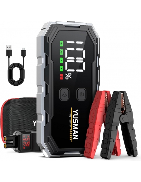 - YUSMAN Non è solo un booster auto, ma anche una portatile Banca di potenza compatta di grande capacità, 12800mAh in grado di caricare facilmente telefoni, tablet o altri dispositivi,Dotato di una porta di uscita USB da 5 V/3A, QC3.0.starter batteria auto per schermo LCD mostra la potenza rimanente e lo stato operativo dell'avviatore di avviamento.
