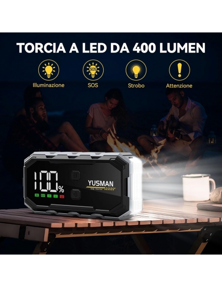 - YUSMAN Torcia a LED incorporata, 400 lumen di luminosità, in grado di illuminare una gamma più ampia di notte, con 4 modalità:Illuminazione/Attenzione/SOS/Strobe, molto adatta per campeggio, esterno, interno, emergenza, viaggi, ecc. booster avviamento auto lo strumento ideale per l'uso quotidiano, viaggi, gite all'aperto, situazioni di emergenza.Inoltre, starter auto portatile sue dimensioni sono molto ridotte, quindi è facile da trasportare o da mettere in valigia.