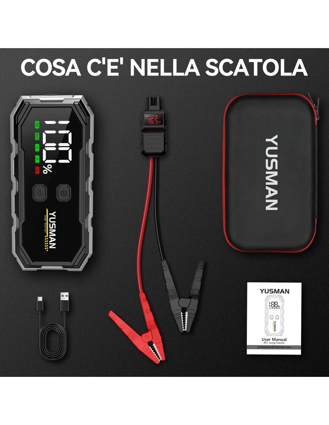 - Il prodotto include: 1*YUSMAN Booster Avviamento Auto,1* clip intelligente di starter batteria auto,1* Cavo dati USB, 1* Manuale utente per avviatore batteria auto, 1 * Sacchetto di stoccaggio per avviatore emergenza per auto, non esitate a contattarci attraverso Amazon se avete problemi durante l'uso. Il nostro team tecnico professionale è sempre qui per aiutarvi. Nota: Il nostro prodotto non include una testina di ricarica dell'adattatore. È possibile utilizzare adattatori 5V/2A o 5V/3A per caricare starter auto portatile per uso quotidiano.