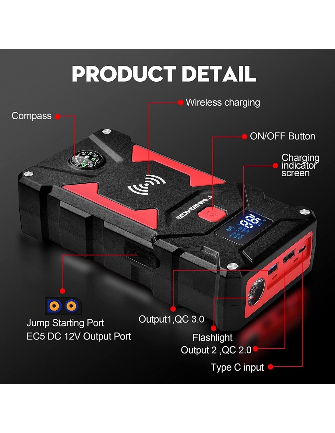 - L'avviatore FNNEMGE con una corrente di picco di 6000A, può avviare veicoli a 12V(Adatto a Tutti i Veicoli a Benzina o 10,0L Diesel) in pochi secondi fino a 30 volte. È adatto per auto, camion, motociclette, tosaerba, yacht, pick-up e altri veicoli simili.Inoltre, è dotato di un'uscita EC-5, che lo rende facile da usare per compressore d'aria e altri attrezzi automobilistici a 12V.