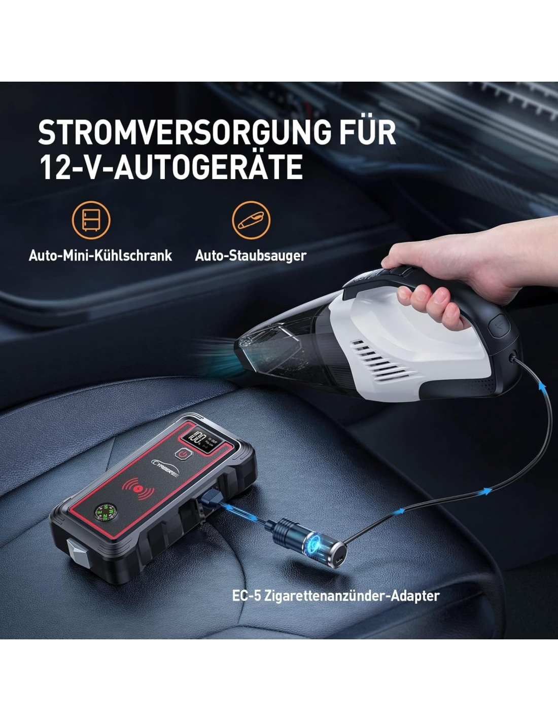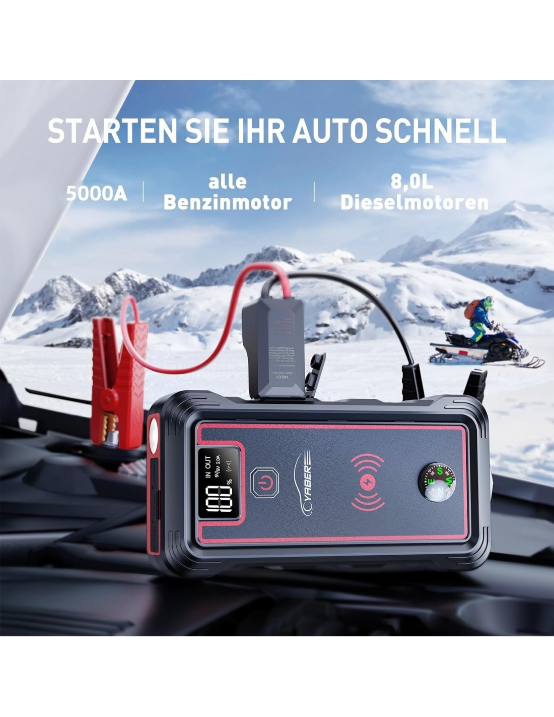 - 【5000A POTENTE AVVIATORE AUTO】YABER starter può avviare veicoli a 12V (Tutti i Veicoli a Benzina o 8.0L Diesel) in pochi secondi. Adatto per la tua auto, camion, moto, barca, camper o trattore e così via. Inoltre, ha dimensioni molto contenute ed è, per questo, facile da trasportare o da tenere nel bagagliaio in caso di emergenza.